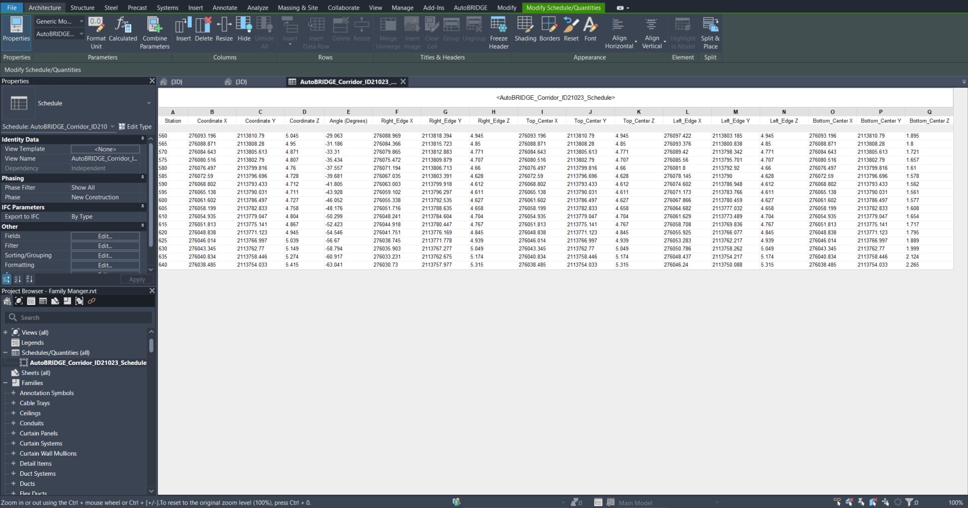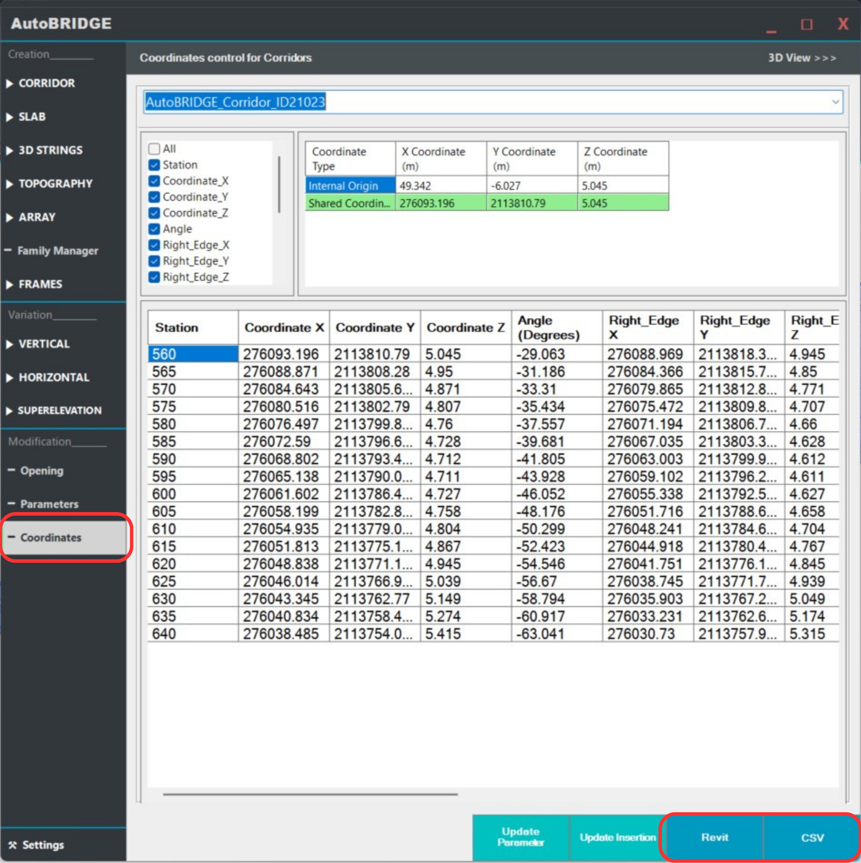 Open the Coordinates tool in AutoBRIDGE and select your corridor. The system automatically identifies all points across all stations.