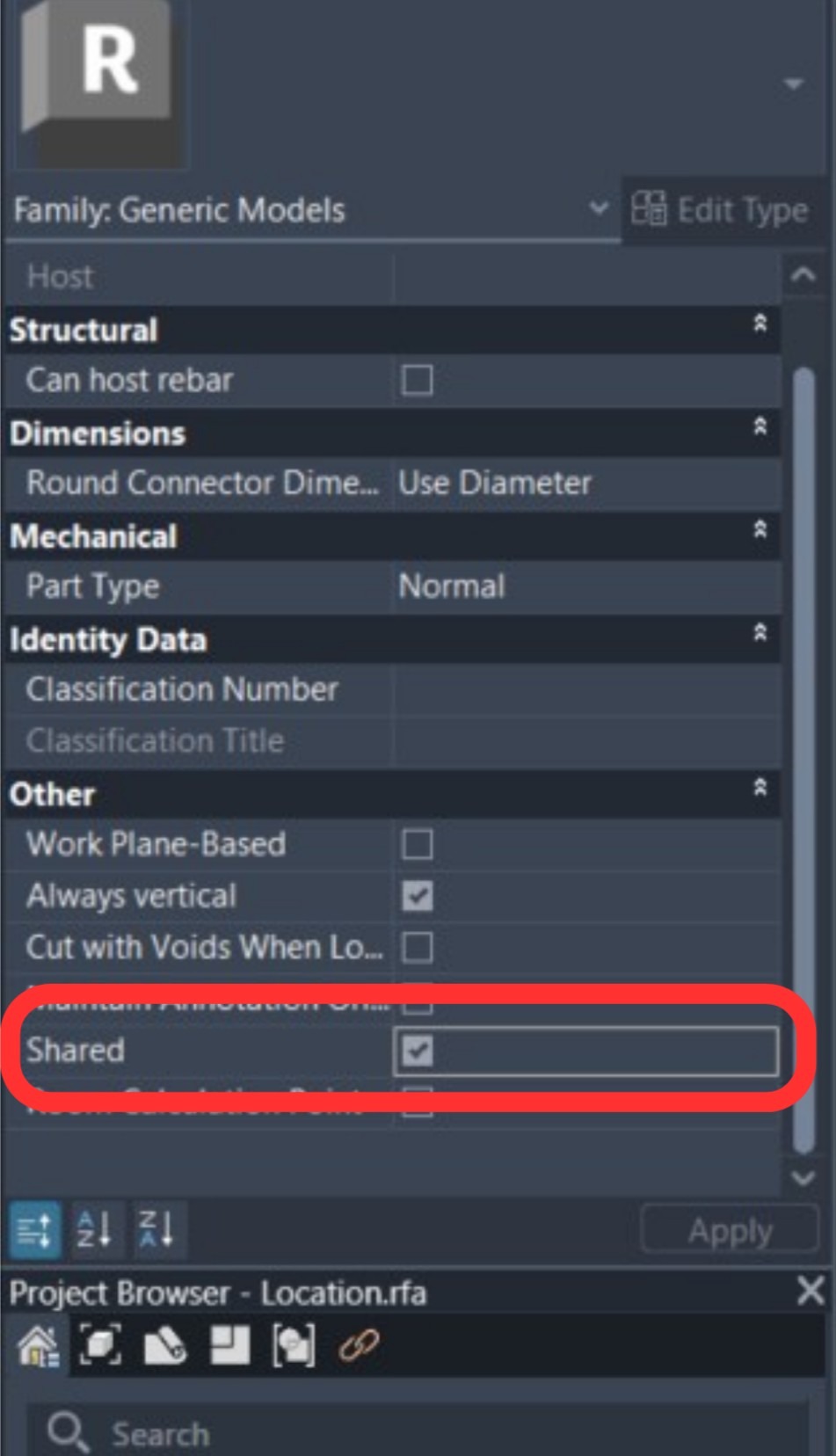 Ensure the location family is set to Shared within the Family Category and Parameters dialog.