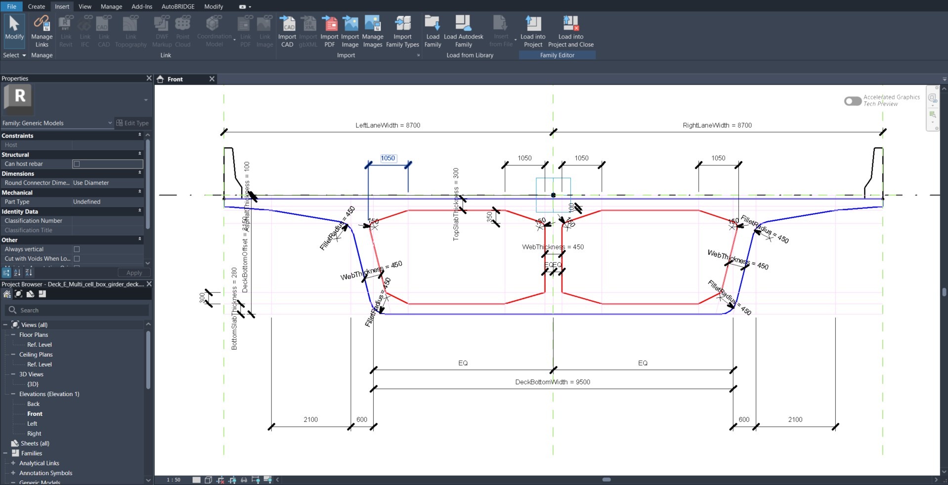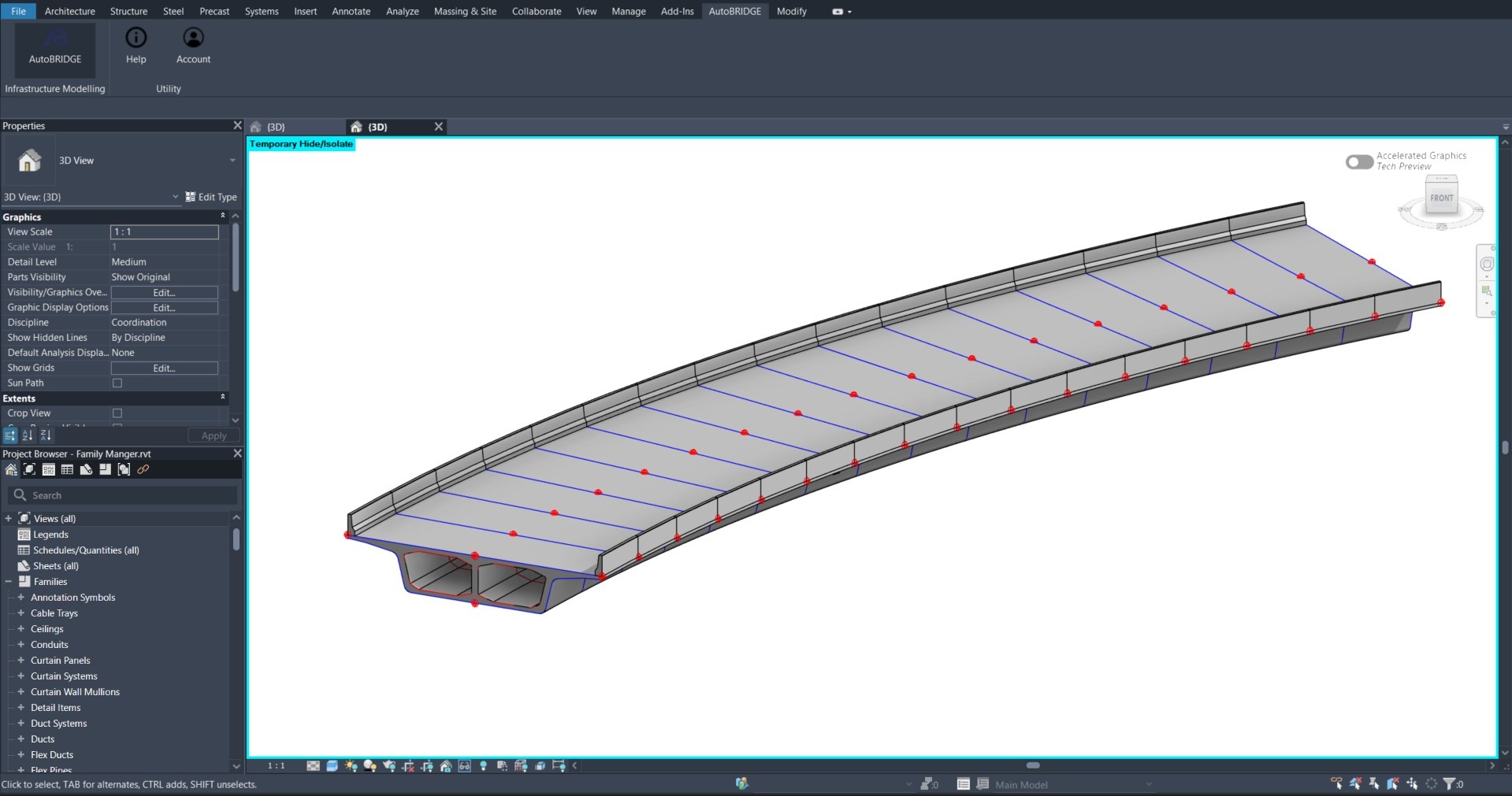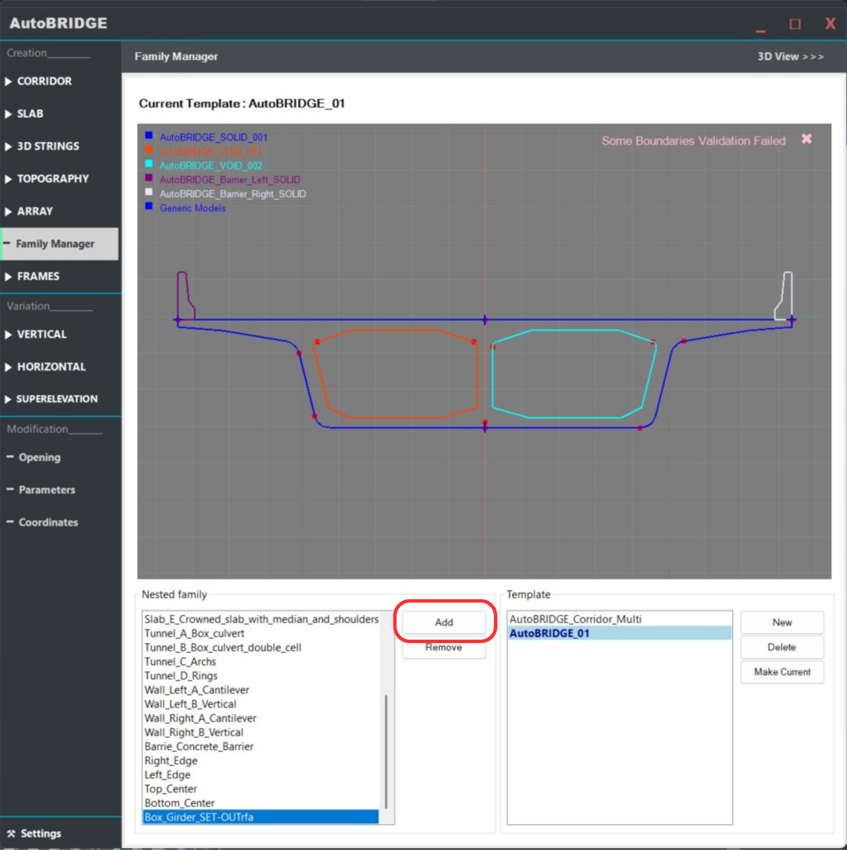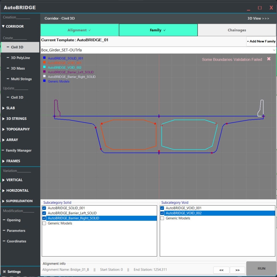 Generate a corridor using this nested family via any AutoBRIDGE method (Civil3D, 3DPolyline, or 3DMass). Refer to the Corridor Creation Workflow.